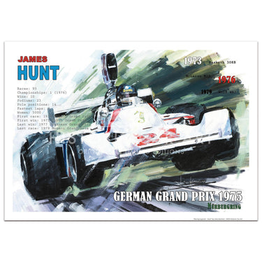 James Hunt charges through the field in his Hesketh during the 1975 German Grand Prix at the Nurburgring only to retire on lap 11 with a broken wheel hub.