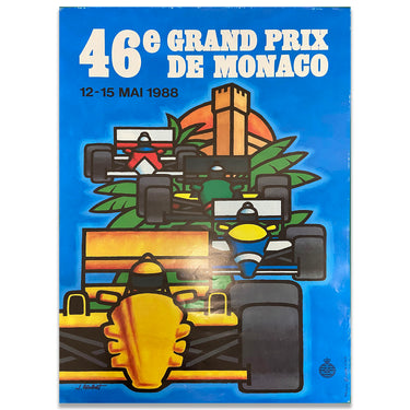 An original poster for the 1988 Monaco Grand Prix. The race was won by Alain Prost for McLaren-Honda. The qualifying for this race saw probably the greatest ever pole position lap in the history of Formula 1 when Ayrton Senna took pole from team-mate Alain Prost by a scarcely believable 1.4 seconds around the streets of the principality. Whilst leading the race by over 50 seconds Senna crashed into the barrier on lap 67 when he lost concentration.