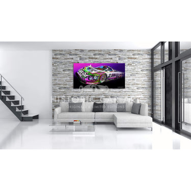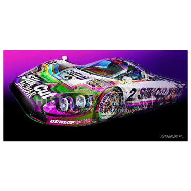 Stunning digital painting on brushed aluminium artwork. The Jaguar XJR-9 was designed by Tony Southgate and built by Tom Walkinshaw Racing (TWR) featuring a Jaguar 7.0-litre V12 engine. This Silk Cut sponsored car won Le Mans 24 Hours in 1988 driven by Andy Wallace, Johnny Dumfries and Jan Lammers.