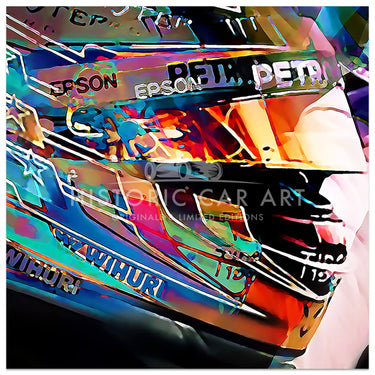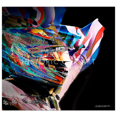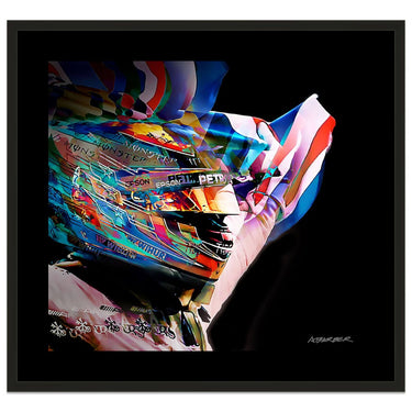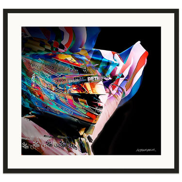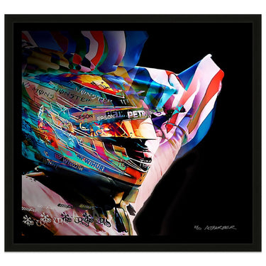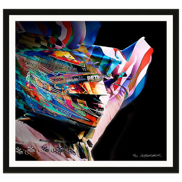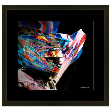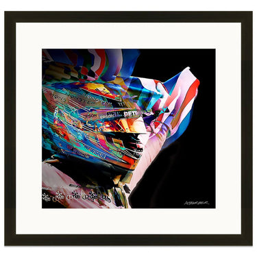 Lewis Hamilton celebrating victory at the 2017 British Grand Prix at Silverstone. A semi-abstract artwork print.