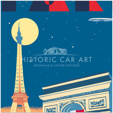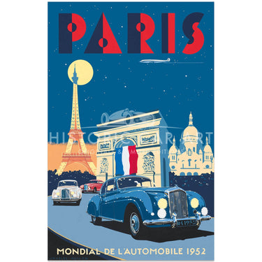 A Pullman Editions poster by Charles Avalon depicting the Paris Mondial de l’Automobile, the world’s first motor show, launched in 1898 by industry pioneer, Count de Dion. The event is still one of the most important auto shows to this day. In Avalon’s stylised poster rendering, three elegant Bentley Continental ‘fastbacks’ are shown weaving their way through Paris’ most famous landmarks.