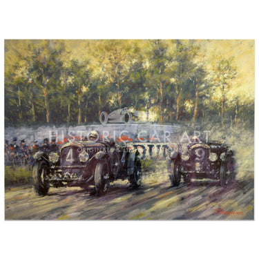 Limited edition framed print by Peter Hearsey. Bentleys at Le Mans, 1930. The winning Bentley Speed Six driven by Woof Barnato & Glen Kidston, followed by the Bentley Blower of Sir Henry 'Tim' Birkin & Jean Chassagne who sadly didn't finish the race.