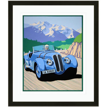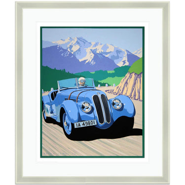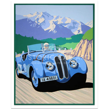 Limited Edition Print. A 1938 BMW 328 driving through the Swiss / French Alps.
