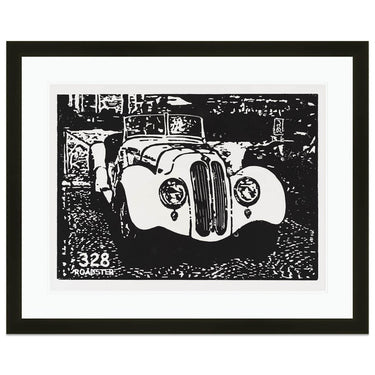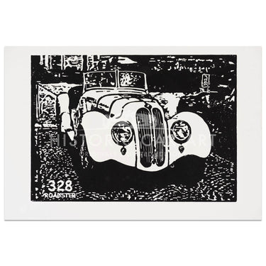 A hand printed woodcut of the BMW 328 Roadster in white.