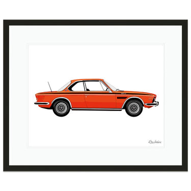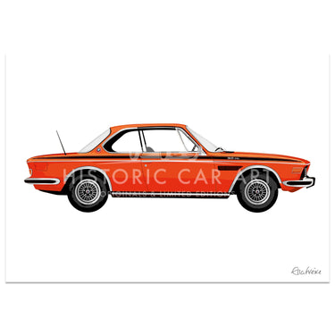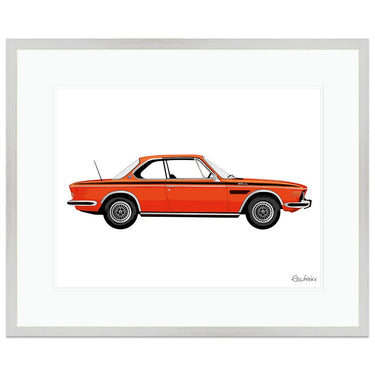 Fabulous limited edition print by Ella Freire of a 1973 BMW 3.0 CSL in orange. The BMW 3.0 CSL was a road legal homogated version of the BMW that raced in the European Touring Car Championships.