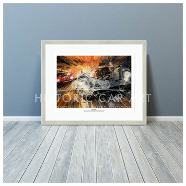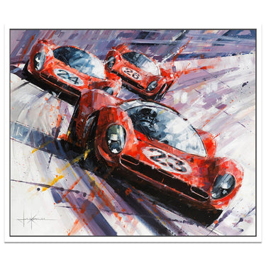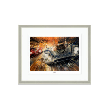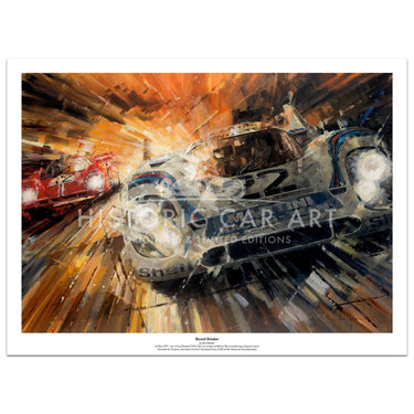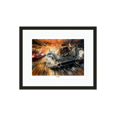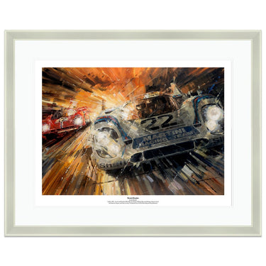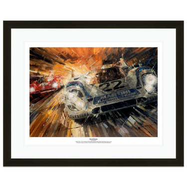 Limited Edition Porsche Art Print. Le Mans 1971 - the winning Porsche 917K of Gijs van Lennep and Helmut Marco establishing a distance record that stood for 39 years, seen here in front of 3rd placed Ferrari 512M of Sam Posey and Tony Adamowicz.
