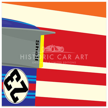 The artwork for each Studio Bilbey print is hand-drawn from scratch - including all the lettering and sponsors logo's, after extensive research into each cars race history and the graphics it carried. The result is the fresh, bold, clean-cut artwork you see here.
