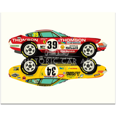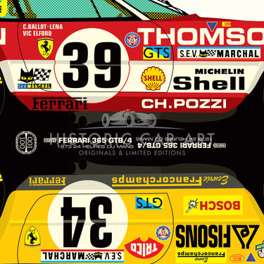 Two rival Ferrari 365GTB/4 'Daytona' entered for the 1973 Le Mans 24 Hours. The #39 car driven by Vic Elford and Claude Ballot-Léna won the GTS 5.0 class finishing 6th overall. The Ecurie Francorchamps car finished in 20th place.