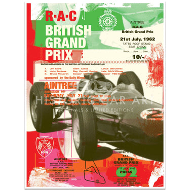 This contemporary art poster celebrates the results of the 1962 British Grand Prix. It is drawn by hand, from scratch including all text after careful research into the period ephemera from the event.