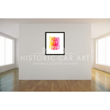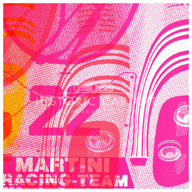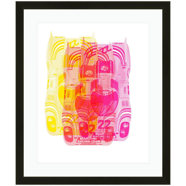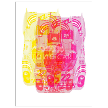 The Le Mans 24H 1971 winning Martini Racing Porsche 917K of Helmut Marko and Gijs van Lennep. Reimagined here in a colourful hand-pulled screen print by artist Ian Bilbey. Each of the three colours is individually applied through a fresh screen to produce this dramatic contemporary artwork.