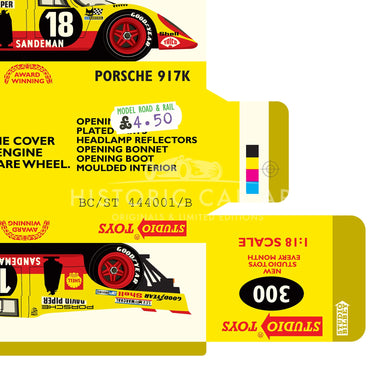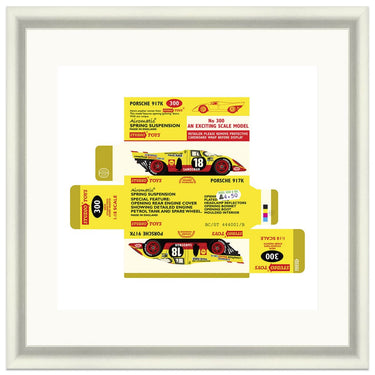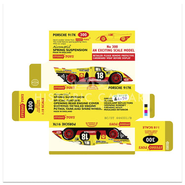 Porsche car art with a twist! Studio Bilbey has created a fantasy toy car box featuring the 1970 Le Mans 24h Porsche 917K of David Piper. Drawn in the style of a 1970's matchbox toy box we all remember and detailing some of the features of the 917K... Is there another piece of contemporary automotive art as different as this?