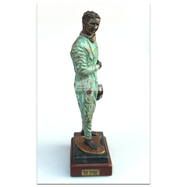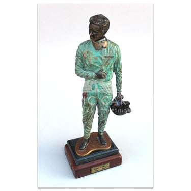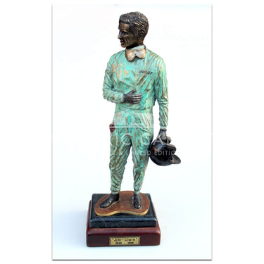 A bronze sculpture statue of double Formula 1 World Champion Jim Clark. Jim Clark won the World Championship in 1963 and 1965 for Lotus. He also won the 1965 Indianapolis 500 race.