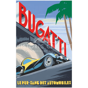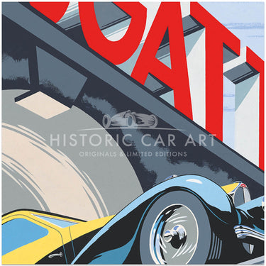 Pullman Editions poster by Charles Avalon - Bugatti has always been renowned both for the level of detail of engineering in its automobiles, and for the artistic way in which their designs are executed. The beautiful Bugatti Type 57 Atalante was effectively the marque’s last production model. It was designed by Ettore’s son, Jean Bugatti, as a two-seater sports coupe, a two-tone paint scheme accentuates the ‘French curve’ on the car’s flanks. This poster celebrates beautifully the famous French Marque.