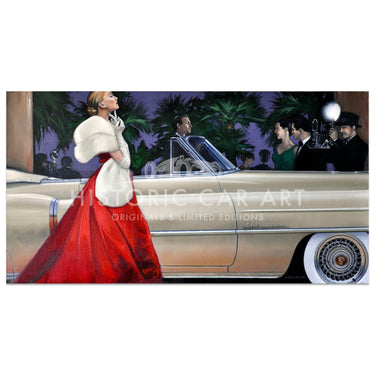A beautiful original painting by Roy Putt. A young starlet arrives at the entrance to the Carlton Hotel, Cannes in a Cadillac Eldorado, wearing a Dior Dress. Her manager greets fellow guests at the 1952 film festival.