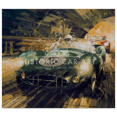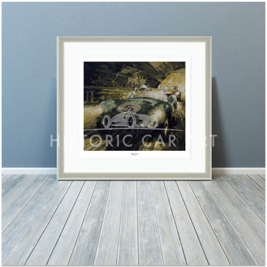 Limited Edition Print. Le Mans 1959 - After contesting every Le Mans 24hr. since 1931 Aston Martin finally secured victory with the winning DBR1 of Shelby and Salvadori seen here in front of the 3rd. placed and GT class winning Ferrari 250 GT TdF Berlinetta of Blaton and Dernier.