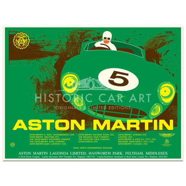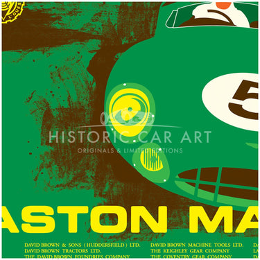 It shows the Aston Martin DBR1 that raced in, and won, the Le Mans 24 Hours in 1959. The poster details all of the correct period contact information.