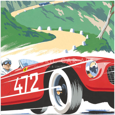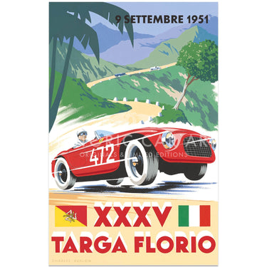 Pullman Editions poster by Charles Avalon - This poster celebrates the 1951 Targa Florio. The Scuderia Marzotto Ferrari of Giovanni Bracco and Franco Cornacchia placed second in the 1951 Targa Florio to Franco Cortese in a Frazer Nash Le Mans Replica.