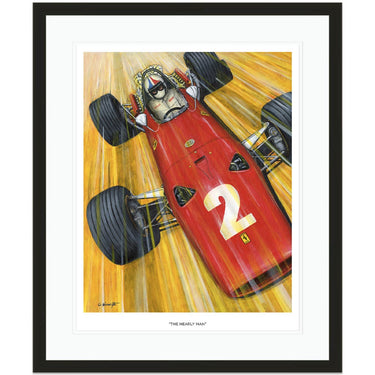 Limited edition print of The Nearly Man, by Chris Wainwright. Chris Amon driving the Ferrari 312/67. He's regarded as the greatest Formula 1 driver never to win a championship Grand Prix race. Although he came close on many occasions, bad luck with his cars reliability stopped him.