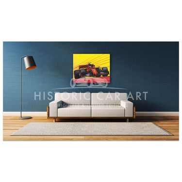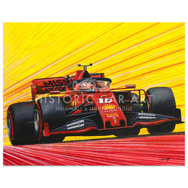 Original Painting, Forza Charles, by Chris Wainwright. After a strong rookie year at Sauber in 2018 Charles Leclerc earned a promotion to the Ferrari team for 2019, where he would be driving alongside Sebastian Vettel. He instantly took the fight to Vettel and finished the 2019 season with more wins, poles and points than the four-time World Champion. His seven pole positions in 2019 was more than anyone else that year, and he clinched the first two Grand Prix victories of his career at the Belgian and Italian rounds that season.The Ferrari Leclerc drove during 2019 was named the SF90 to celebrate the company's 90th anniversary.