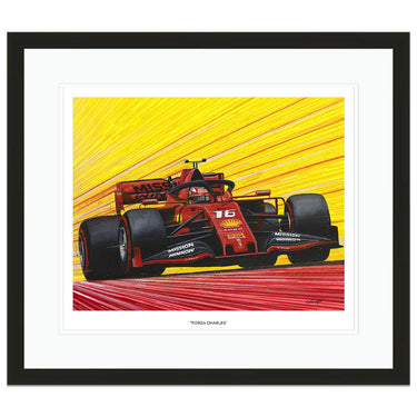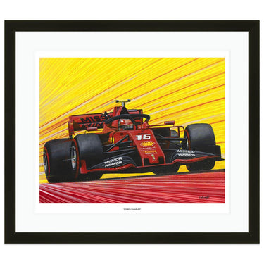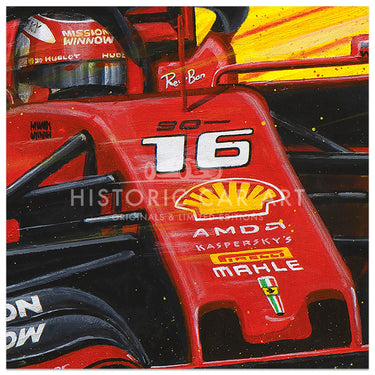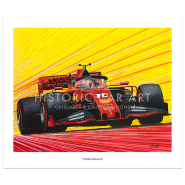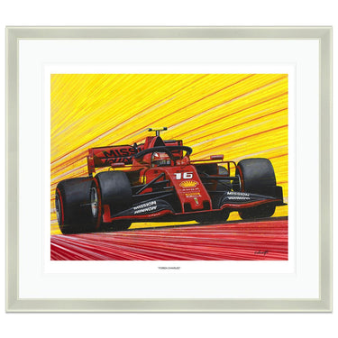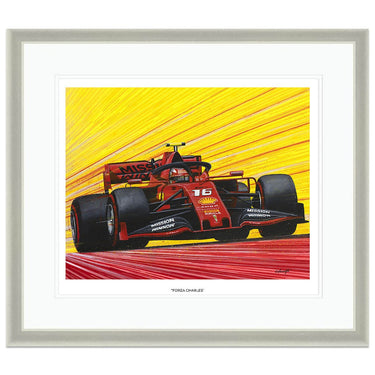 Limited edition print of Forza Charles, by Chris Wainwright. After a strong rookie year at Sauber in 2018 Charles Leclerc earned a promotion to the Ferrari team for 2019, where he would be driving alongside Sebastian Vettel. He instantly took the fight to Vettel and finished the 2019 season with more wins, poles and points than the four-time World Champion. His seven pole positions in 2019 was more than anyone else that year, and he clinched the first two Grand Prix victories of his career at the Belgian and Italian rounds that season.The Ferrari Leclerc drove during 2019 was named the SF90 to celebrate the company's 90th anniversary.