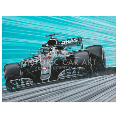 Original Painting, Hammer Time, by Chris Wainwright. Hamilton clinched his fifth World Drivers' Championship in 2019, winning eleven Grand Prix over the course of the season. However Hamilton didn't have it easy. The 2018 season was a title battle between both the Mercedes and Ferrari teams, and Lewis Hamilton and Sebastian Vettel who at the time were both four-time world champions. The points lead changed hands between the two drivers five times throughout the year, with Vettel leading the title battle by eight points at the halfway stage, however it was Hamilton who went on to clinch his fifth World Drivers' Championship title, while the Mercedes team also clinched their fifth consecutive World Constructors' Championship.