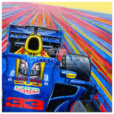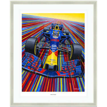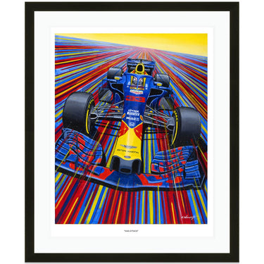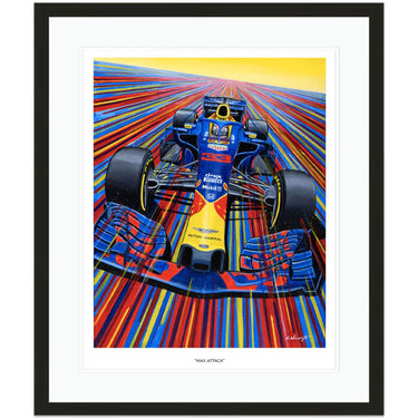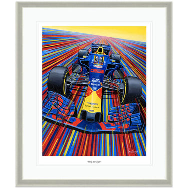 Limited edition print of Max Attack, by Chris Wainwright. The 2019 season saw Max Verstappen win three Grand Prix aboard his Honda powered Red Bull RB15, these victories coming in Austria, Germany and Brazil as well as claiming his first ever Pole Position in Hungary. Max entertained at his home race in Austria, after a poor start he was down from third to eighth before coming through to pass Leclerc for the lead with three laps to go.