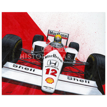 Original Painting, Total Commitment, by Chris Wainwright. Ayrton Senna claimed the first of his three World Championships in this McLaren MP4/4. Throughout the season he had an epic battle with Alain Prost, but the Brazilian took the title with 8 Grand Prix wins, to Prost's 7.