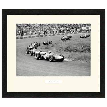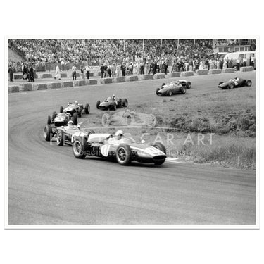 This photograph taken during the first lap of the 1960 Dutch Grand Prix shows Jack Brabham in his Cooper ahead of pole position man Stirling Moss in his Lotus. Jack Braham would go on the win the race.