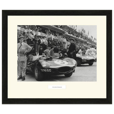 This photograph shows the winning Ecurie Ecosse Jaguar D-Type of Ron Flockhart and Ivor Bueb in the pit lane at Le Mans in 1957.