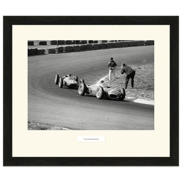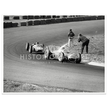 This photograph shows Phil Hill in his Ferrari leading Jim Clark in his Lotus during the 1961 Dutch Grand Prix. The pair finished 2nd and 3rd behind Wolfgang von Trips (Ferrari).