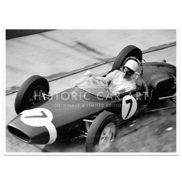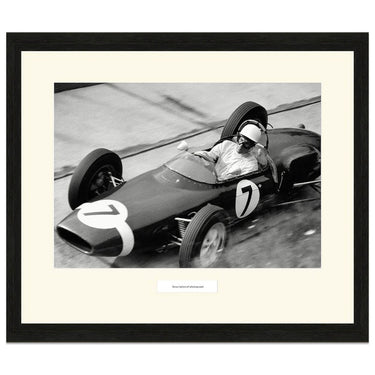This photograph shows Stirling Moss in his Lotus 21 at the Karussell during the 1961 German Grand Prix. He won the race from 3rd on the grid beating the Ferrari's of von Trips and Hill.