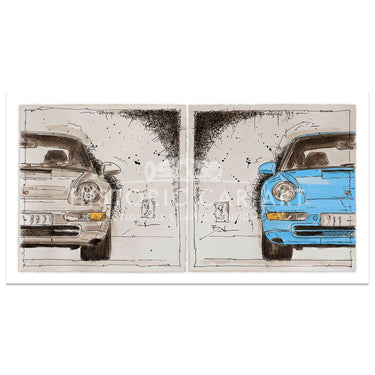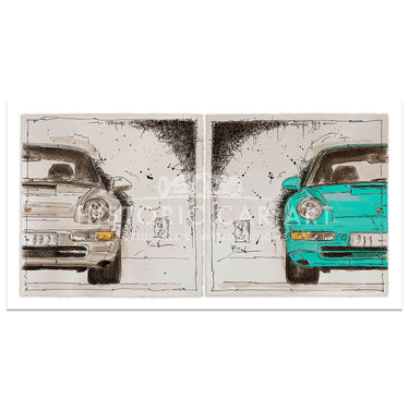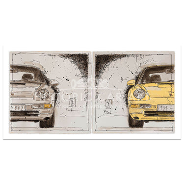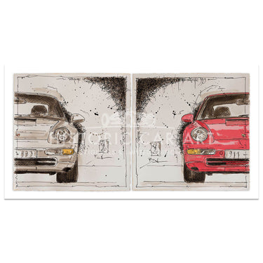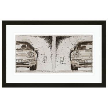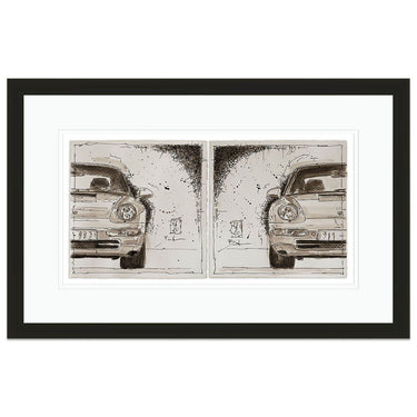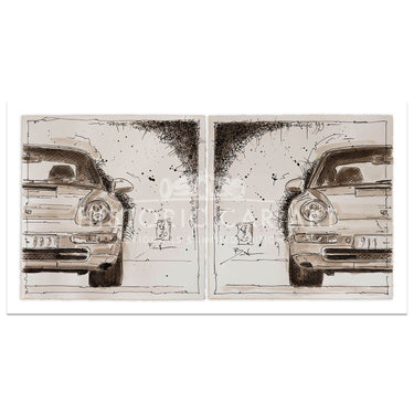 A double image art print of the 993 Porsche 911, from an original ink drawing.