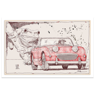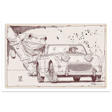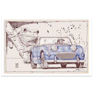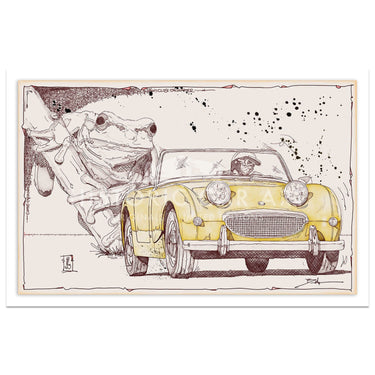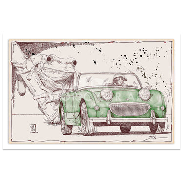 An art print of the Austin Healey Sprite Frogeye. This image shows the small British sports car in action. The frog in the background is a reference to the Sprite Mk1’s nickname - Frog or Frogeye it was affectionately called because of its prominent headlights.