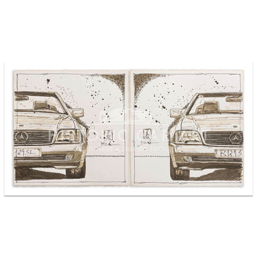 An double image art print of a Mercedes Benz R129SL, from an original ink drawing.
