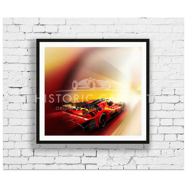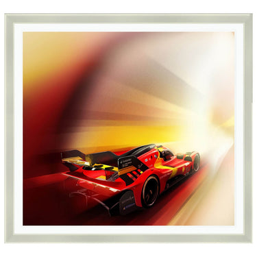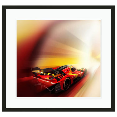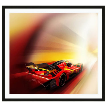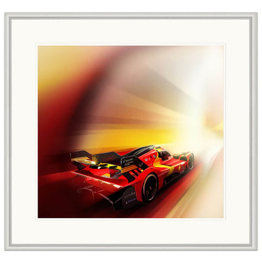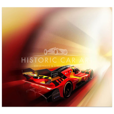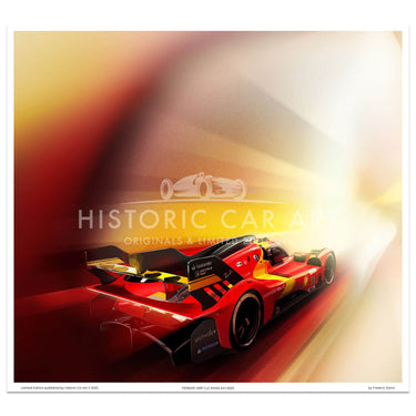 Contemporary art print of the 2023 Le Mans winning Ferrari 499P by designer Frederic Dams. Driven by James Calado, Antonio Giovinazzi and Alessandro Pier Guidi, this is Ferrari's first win since 1965!