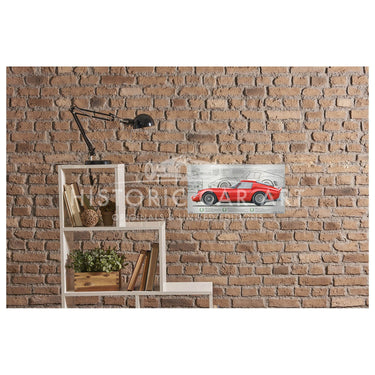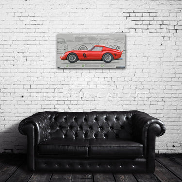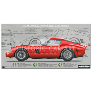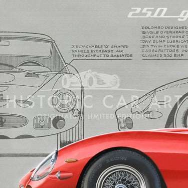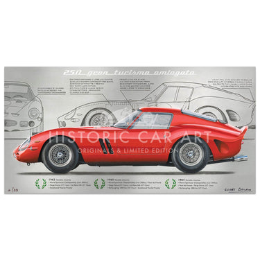 An fantastic aluminium art print of the Ferrari 250 GTO by Geoff Bolam. The car featured is a 1963 spec car and the artwork highlights some of the car's outstanding competition results and technical features. A technical drawing based on original factory drawings is in the background.