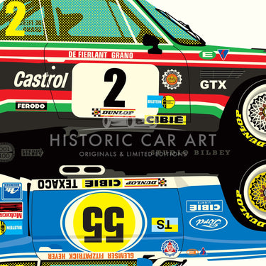 Bilbey's illustrative graphic artwork is all hand drawn - including all the lettering and sponsors logo's, after extensive research into each cars race history and the graphics it carried.
