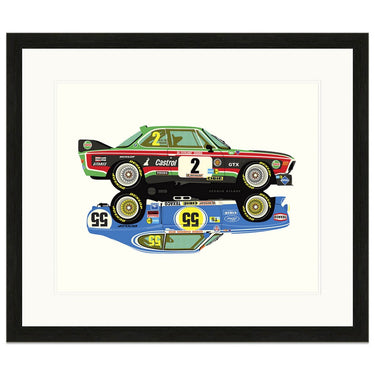 BMW 3.0 CSL / 3.5 CSL and Ford Capri 2600RS / 3100RS. Great rivals through the early to mid 1970's as part of the European Touring Car Championships. Although the two cars in this artwork never raced in the same season they are perfect examples of the cars that did.