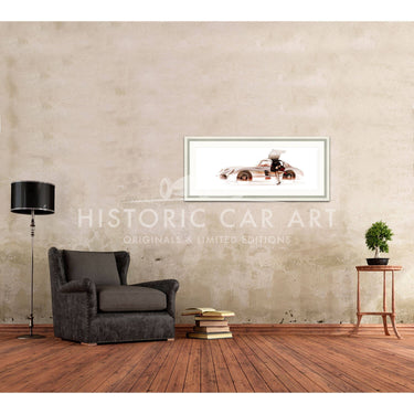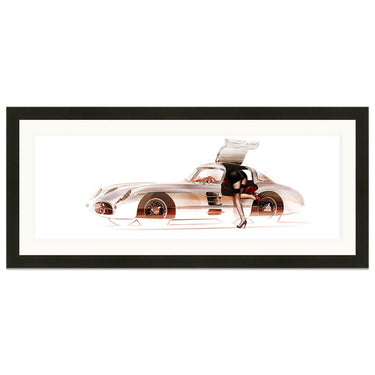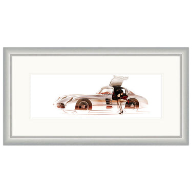 Mercedes-Benz 300SL Gullwing Art Print. Artist Frederic Dams likes to inject cheeky humour into some of his artwork. This great portrayal of a lady climbing into a silver Mercedes Gullwing is a typical example.