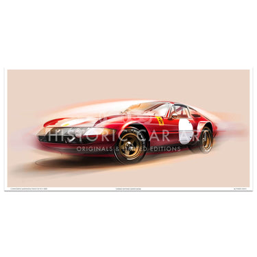 Contemporary art print of the Ferrari Daytona Competizione by designer Frederic Dams. The Competizione versions of the 365 GTB/4 Daytona were developed from the standard road cars.