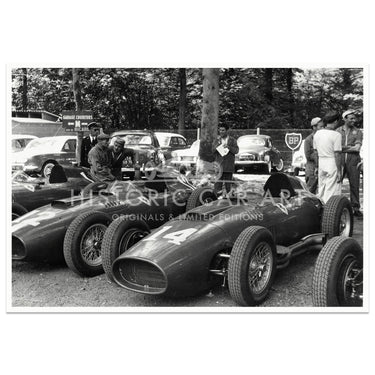 This photograph shows the Ferrari pit at the 1957 French Grand Prix and the cars of Mike Hawthorn and Peter Collins before the race.