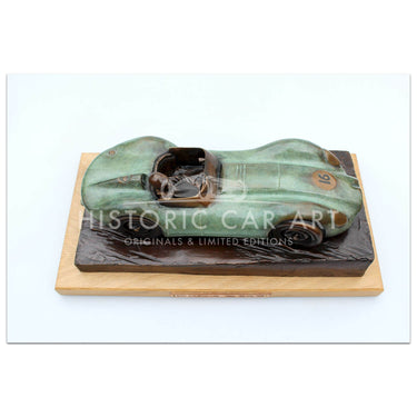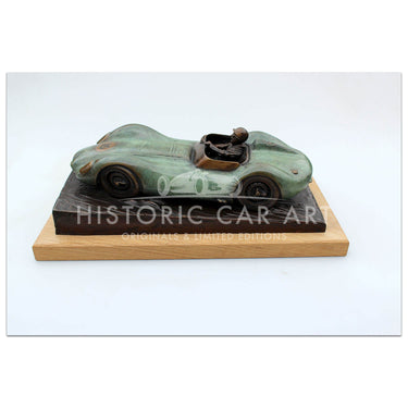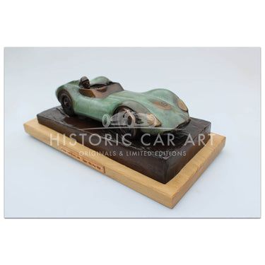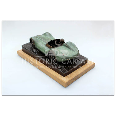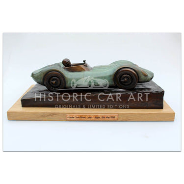 Bronze sculpture by Gary Smith of Archie Scott Brown driving the Lister Jaguar at Spa 1958.