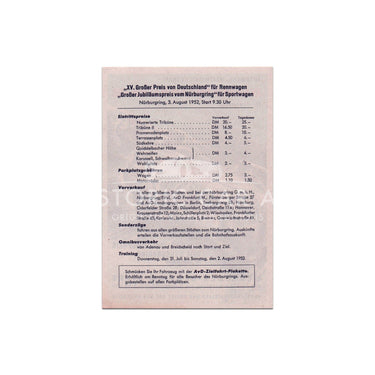 Original vintage flyer for the 1952 German Grand Prix sportscar supporting event. The race was won by pre-War Mercedes GP ace Hans Hermann from post-War Mercedes GP driver Karl Kling both driving the W194 300SL. This beautiful little colour double-sided flyer is is perfect unused condition. It features dynamic artwork by artists Hans Liska to the front, and details of the event on the rear. A lovely item for any serious collector of Mercedes-Benz.