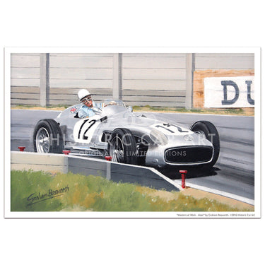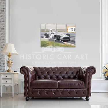 Stirling Moss and the Mercedes W196 classic racing car print available on paper or canvas.