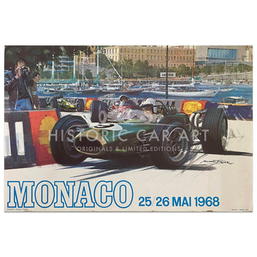 Original vintage poster for the Monaco Grand Prix 1968. The artwork by Michael Turner shows the 1967 race winning Brabham-Repco of Denny Hulme. The 1968 race was won by Graham Hill for Lotus.