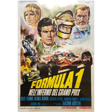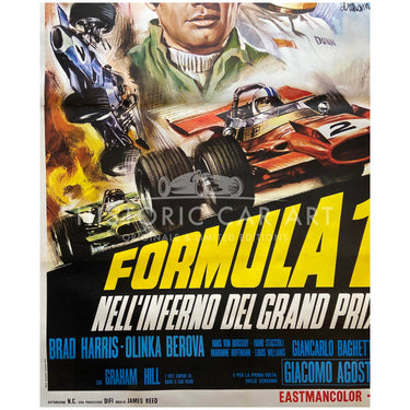 This very large poster for the film Formula 1 directed by Guido Malatesta and released in 1970. Staring Brad Harris, Olga Schoberová, Ivano Staccioli and Graham Hill as himself. Ken Stark (Brad Harris), a Formula One race driver, will do anything to win the championship and beat Frank Donovan...