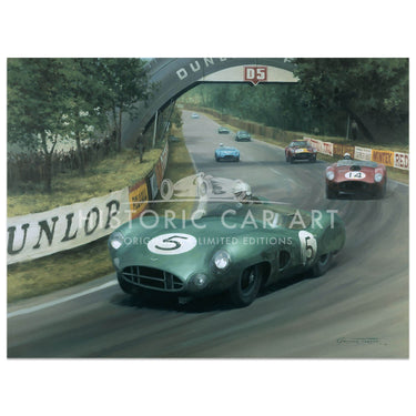 Limited edition print. The Aston Martin DBR1 of Roy Salvadori and Carroll Shelby crossed the finishing line to take the victory at the 1959 Le Mans.