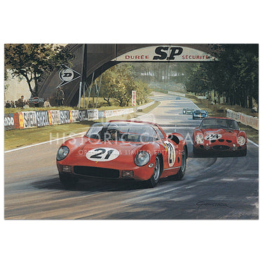 Limited edition print. The winning works entered Ferrari 250P of Ludovico Scarfiotti and Lorenzo Bandini leads the second placed Ecurie Francorchamps Ferrari 250GTO of Jean Blaton ("Beurlys") and Gerald Langlois van Ophem into Tertre Rouge.