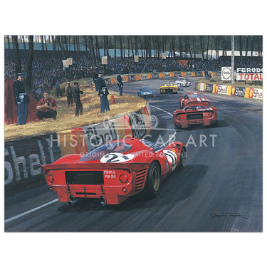 Limited edition print. The Ferrari 330 P4, one of the most beautiful and charismatic sportscars of all time, here driven by Ludovico Scarfiotti and Mike Parkes, sweeps into the Esses during the early laps of the gripping 1967 Le Mans 24 Hours.