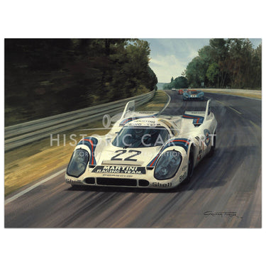 Limited edition print. The winning Porsche 917K of Helmut Marko and Gijs van Lennep flashes through the Mulsanne kink ahead of the Siffert/Bell long-tailed 917. The fastest cars attained over 230mph on the Mulsanne straight in this year, and the winning car took victory at a record average speed of 138.19 mph over the 24 hours.